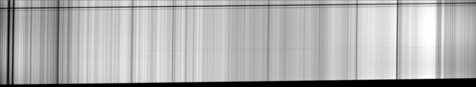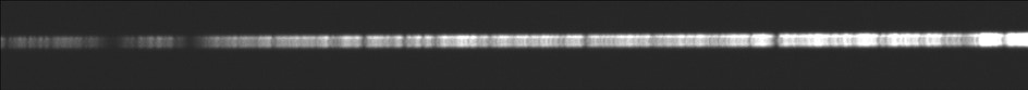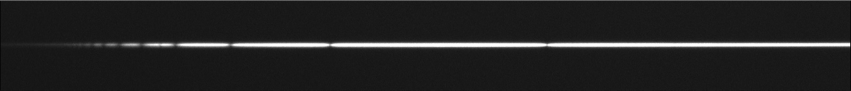 Noter que de par son principe optique, UVEX produit un spectre bien net que sur une hauteur de fente relativement restreinte (suivant la direction spatiale). UVEX est surtout fait pour observer des objets ponctuels, comme des étoiles (mais vous pouvez aussi réaliser le spectre de petites nébuleuses, de noyaux de galaxies…). En dehors de la zone de netteté, une forme d’astigmatisme se produit, qui a pour effet d’élargir les raies spectrales, et donc de faire perdre en résolution spectrale. Examinez l’image spectrale ci-après :