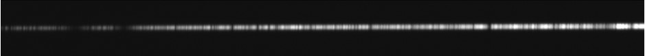 - si lors de l’observation d’une étoile au télescope, l’image de la fente est bien nette dans la caméra de guidage, ainsi que l’image de l’étoile (elle apparait ponctuelle), mais que la trace du spectre est désespérément uniformément et anormalement large sur toute sa longueur (voir l’exemple ci-après sur un extrait de spectre de l’étoile Arcturus fait avec UVEX équipé d’un réseau de 1200 traits/mm au foyer d’un télescope ouvert à F/10) :