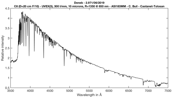 Il s’agit du spectre de la brillante étoile Deneb obtenu en montant UVEX au foyer d’un télescope Celestron 8. Ci-dessous, un détail de la partie violette et bleu de ce spectre montrant que la netteté est conservée dans ce domaine, une caractéristique peu commune dans l’offre de spectrographes pour les amateurs :