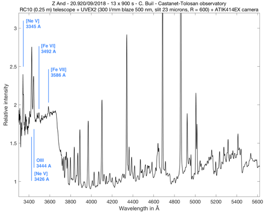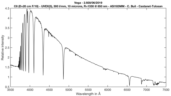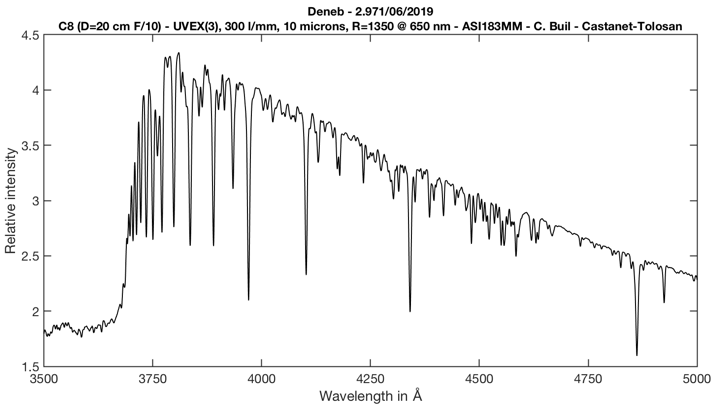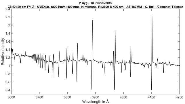 Ci-après la partie UV et bleu du spectre de l’étoile P Cygni obtenu avec un réseau 1200 traits/mm et une fente assez étroite (14 microns) afin de maximiser la résolution spectrale. Le télescope employé est relativement modeste en diamètre, un Celestron 8 :