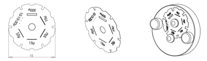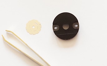 Une option consiste à employer une fente dite « claire », faisant aussi partie du « kit Alpy » pouvant être fournie par la société Shelyak Instrument. Il s’agit en fait d’un ensemble de fentes usinées en couronne sur une feuille de nickel de 50 microns d’épaisseur. Vous avez donc le choix de la largeur, avec en plus la présence d’un trou de 25 microns, qui peut constituer une étoile artificielle fort utile lors du réglage sur table. Cette fente est plus économique que le modèle sur verre, plus transparente en particulier dans l’ultraviolet, mais aussi plus fragile et difficile à manipuler. La surface est suffisamment réfléchissante et plane pour réaliser un bon guidage. La fente claire s’adapte sur le support incliné intermédiaire UV06 (la face gravée doit être tournée vers le plan de pose) :