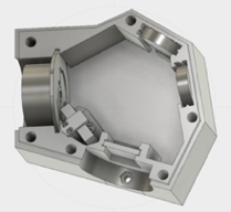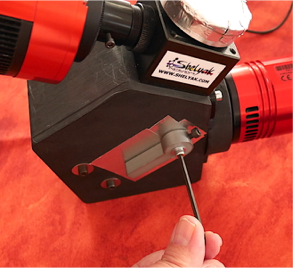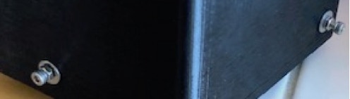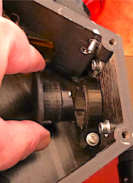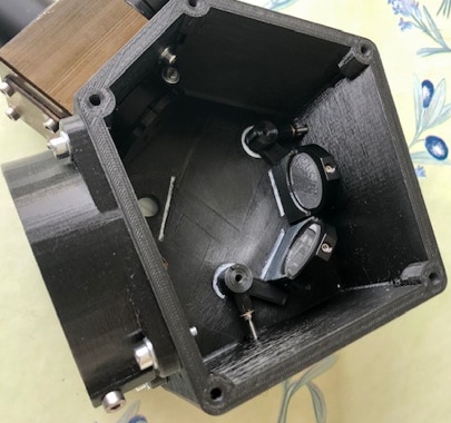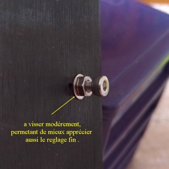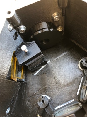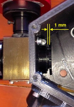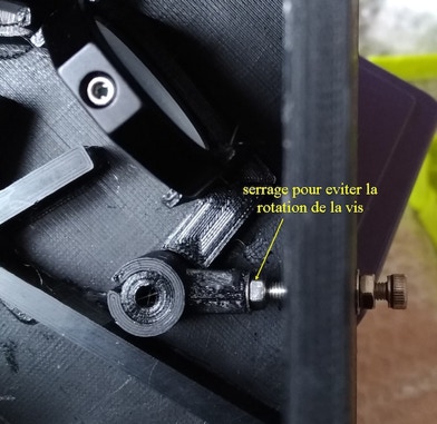 Chacun des supports de miroir est monté avec une vis M4 traversante. Les bordures des supports sont alignées au mieux par rapport aux marques de position du boitier. Les supports sont équipés d’un système à biellette UV11 servant à l’orientation fine des miroirs. Ces éléments peuvent être déplacés en utilisant une vis qui tire et qui pousse, manipulables depuis l’extérieur du boitier après avoir légèrement désserré la vis de fixation des miroirs. Ci-dessous, une vue de ces organes de réglages du côté externe du boitier.