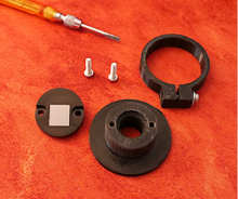 Monter la manette d’orientation extérieure UV13 en utilisant la vis axiale pour que la rotation soit relativement douce et serrer la vis latérale pour que le réseau soit bien entraîné — voir ci-contre. Lors de l’utilisation normale du spectrographe, vous devez tourner cette manette (légèrement) pour positionner le domaine de longueur d’onde souhaité sur la surface sensible du détecteur.