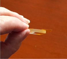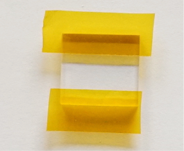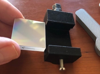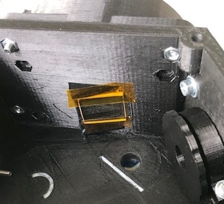 L’étape suivante consiste à monter la lentille cylindrique dans le logement prévu dans le boitier UV01. La face convexe doit être tournée vers l’intérieur du boitier. Attention, il est très important que le plan de pose de la lentille soit bien plan, bien nettoyé des défauts d’usinage 3D et des bavures, la position longitudinale de ce composant est en effet essentielle par rapport aux autres composants optiques (pas de réglage prévu ici, le positionnement est obtenu par construction). Il n’est pas recommandé au départ de procéder à un collage de la lentille. Il est préférable de fixer celle-ci avec un ruban adhésif de qualité, le Kapton, qui adhère bien sur le verre et sur le plastique du boitier. Le nom «Kapton» est une marque commerciale. Il s’agit d’un ruban adhésif polyamide aux propriétés mécaniques, adhésives et chimiques remarquables. Il est par exemple souvent employé en optique ou encore pour fixer des éléments dans des environnements aussi difficiles que des structures satellites. Il est facile de trouver ce ruban adhésif auprès de sites marchands, comme Amazon. Vous devez faire bien attention de ne pas salir la surface optique utile lors des manipulations (si cela arrive, nettoyer la surface de verre en frottant avec du coton humidifié à l’eau dans un premier temps, puis à sec dans un second temps, en changeant fréquemment le coton) :