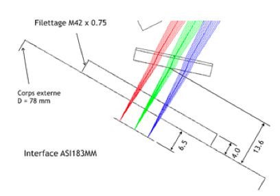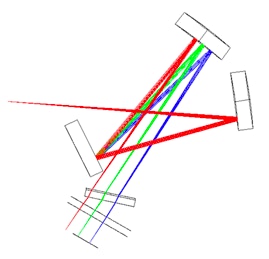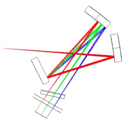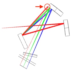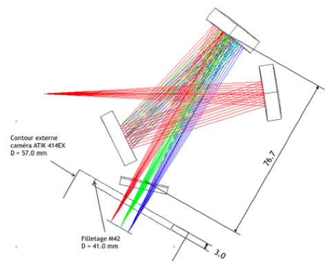 L’ensemble de la pupille du télescope est éclairé. On ne note pas de vignetage optique (perte de rayons par les bords optiques des composants). Les rayons passent cependant très proches des limites mécaniques (noter la partie rouge du spectre qui frôle le bord du réseau en arrivant sur le détecteur). En pratique, il faut agiter la lampe devant la pupille du télescope durant le temps de pose pour obtenir un éclairement à peu près uniforme de celle-ci.