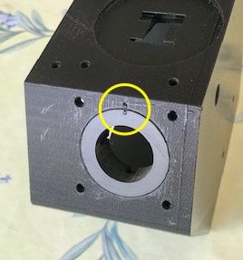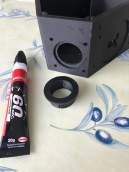 Le première opération consiste à coller la bague de fente UV03 dans le logement prévu du boitier UV01. Il faut bien respecter l’orientation lors du collage, en positionnant en face les repères dessinés sur les pièces (c’est à l’intérieur de cette bague que sera monté glissant le porte-fente proprement dit, qui doit être correctement orienté par rapport aux traits du réseau) :