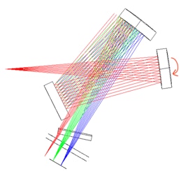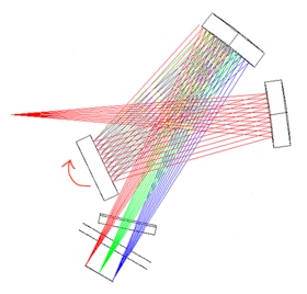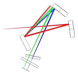 A présent la partie rouge la plus extrême du spectre est vignetée par le miroir M2 et aussi coupée par le bord mécanique du réseau. Pour l’observateur, cela correspond à une atténuation en intensité du côté rouge du spectre enregistré. On observe aussi un glissement du domaine de longueur d’onde (les rayons « verts » n’arrivent plus au centre du détecteur).