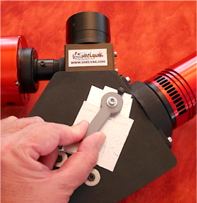 La fente est montée sur son support UV04 (vis M3). On montre dans les vues ci-après l’utilisation d’une fente Shelyak (modèle sérigraphiée dans une couche de chrome déposée sur une face d’une fine lame de verre) :
