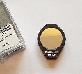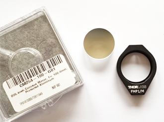 L’ensemble des éléments optiques est disponible auprès de ThorLabs. Les références pour la commande sont indiquées sur le dessin optique ci-contre. Noter que les miroirs concaves sphériques sont utilisés dans des montures (supports) dédiées, elles-mêmes disponibles chez ThorLabs. La distance focale des miroirs est de 100 mm pour un diamètre de 25 mm. Le contour de la lentille cylindrique fait 22 mmm x 20 mm.