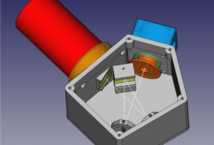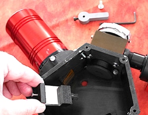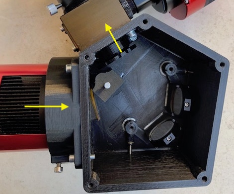 Il est ensuite recommandé de monter maintenant l’interface télescope, ce qui limite le risque de souiller plus tard les composants optiques par des manipulations intempestives. Nous utilisons ici comme interface le bloc de guidage du spectrographe Alpy 600, que vous pouvez vous procurer auprès de la société Shelyak Instrument. Cette pièce de haute qualité en métal, déterminante pour bien observer, est cependant l’élément le plus coûteux du projet UVEX. Une étude est en cours pour proposer comme alternative un sous-ensemble compact, spécialement prévu pour cette fonction, réalisable en impression 3D et qui inclue les éléments d’étalonnage (étalonnage spectral, lampe blanche) ainsi que l’électronique nécessaire. Quatre vis M4 servent à fixer le boitier de guidage :