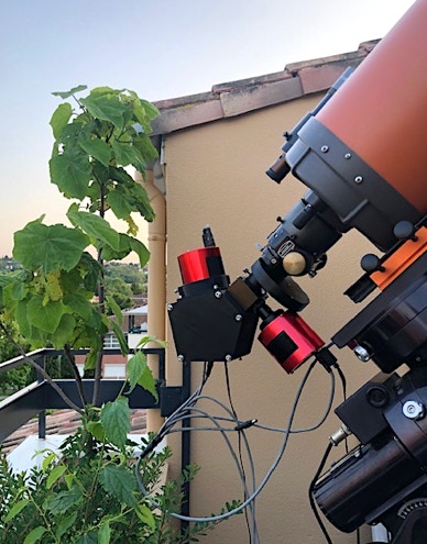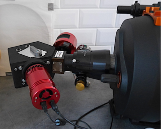 Si l’étanchéité à la lumière du boîtier est malgré tout insuffisante, il faut se résigner à recouvrir le corps du spectrographe d’un ou plusieurs drap(s) noir(s), comme sur la photographie ci-dessous :