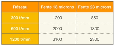 La référence du réseau indiqué est celle du 300 traits./mm blazé à 500 nm. C’est un modèle dont la taille fait 25 mm x 25 mm x 6 mm. Des réseaux compatibles avec des densités de gravures différentes sont au catalogue ThorLab (la densité maximale utilisable sur UVEX est de 1800 traits/mm). Par exemple, le réseau de 1200 t/mm blazé à 500 nm est GR25-1205, alors que celui blazé à 400 nm (spécial l’UV) est GR25-1204.