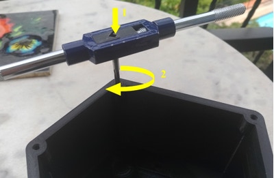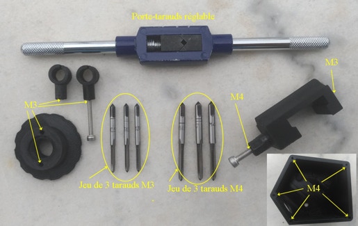 Un certain nombre trous sont à tarauder M3 et M4 (par exemple les trous de fixation du capot sur le boitier). C’est une opération délicate qui doit être réalisée avec soin. On recommande d’utiliser le jeu de 3 tarauds dans l'ordre pour chaque diamètre et de pousser "plutôt fermement" avant de tourner le porte-taraud sous peine de destruction de la matière (seuls les trous M2 du support fente claire UV06 sont à tarauder avec les vis elles-mêmes). Il faut pousser tout le long du premier taraudage et rester le plus possible dans l'axe du trou possible sinon le taraud risque de déraper. Il vaut mieux s’entraîner sur une pièce à vide pour le premier taraudage :