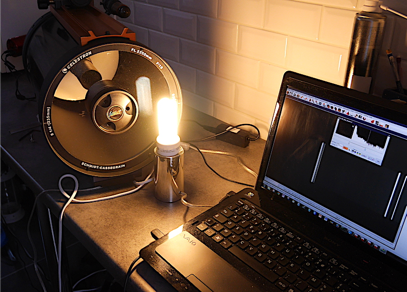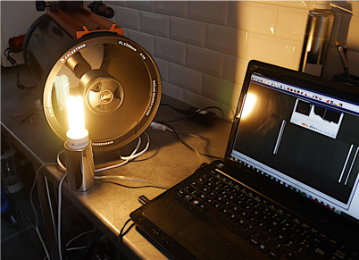 On a vu dans les sections précédentes l’importance de disposer de sources artificielles de raies qui produisent un flux assez fort et que l’on peut disposer face à l’entrée du télescope pour les réglages. En routine, ces mêmes lampes peuvent servir à étalonner en longueur d’onde les spectres scientifiques bien sûr (éclairement en pleine pupille, le meilleur). On recommande de disposer de deux types de lampes peu coûteuses : (1) une lampe fluo-compact (mais attention la législation en Europe fait quelles disparaissent des étalages, remplacées par les calamiteuses lampe LED, mais en cherchant bien on peut encore en trouver), (2) une lampe à décharge au néon que l’on peut trouver sous forme de vielleuse (contrôle des systèmes électriques par exemple).