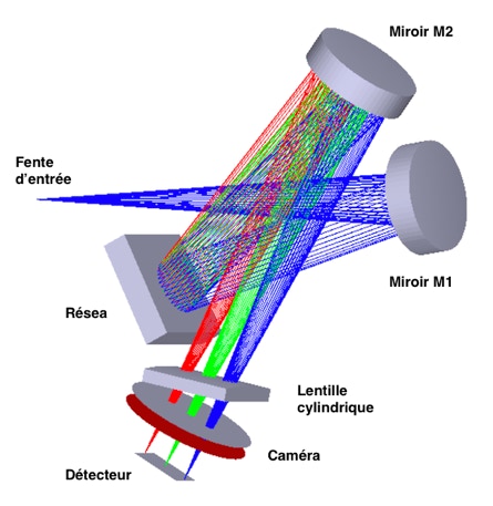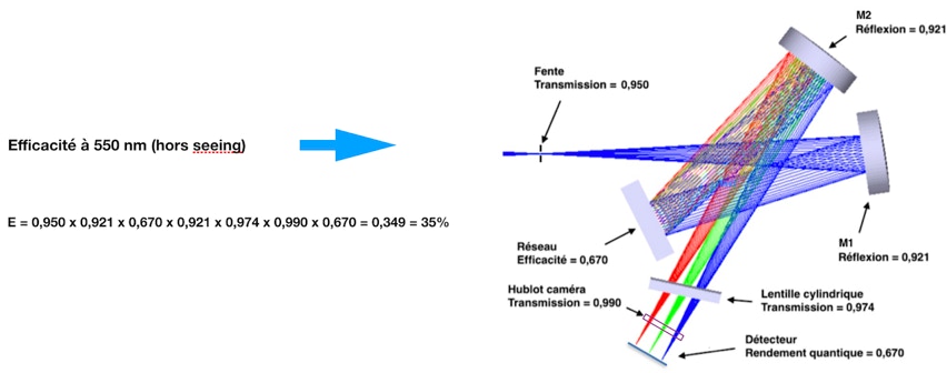 Cette valeur 35% est un efficacité photonique particulièrement élevée pour un spectrographe (le résultat dépend bien sur du rendement quantique propre du détecteur et de la longueur d’onde). Ce résultat vient du schéma optique relativement dépouillé, un choix technique volontariste, mais qui se paye par un accroissement de la difficulté de réglage par rapport à un spectrographe plus traditionnel, on le verra plus loin.