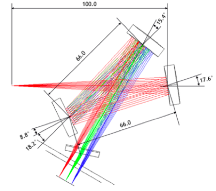 La cotation du schéma optique est donnée dans les figures ci-après (nota : l’orientation du réseau indiquée correspond à une densité de gravure de 300 traits/mm, avec la longueur d’onde 510 nm positionnée au centre du détecteur) :