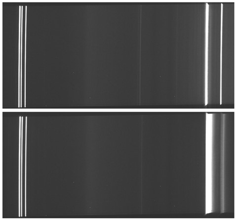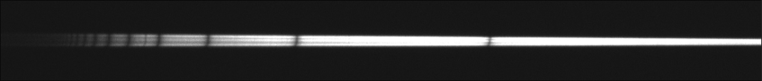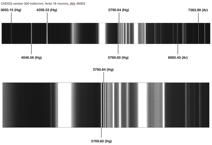 Le spectrographe est correctement réglé lorsqu’en modifiant le calage en longueur d’onde du spectre, les raies spectrales demeurent nettes, comme ci-contre.