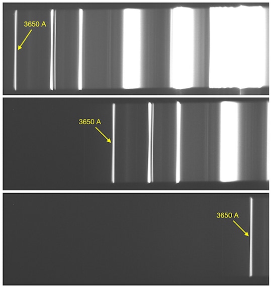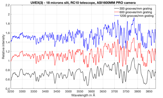 Ci-contre, l’aspect du spectre ultraviolet solaire en fonction de la configuration adoptée. UVEX est ici monté au foyer d’un télescope Ritchey-Chrétien de 10 pouces F/8 qui pointe vers le bleu du ciel diurne.