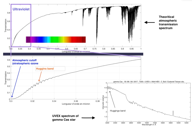 On l’a cité, une caractéristique de UVEX, où les éléments optiques qui ont une puissance sont des miroirs, est de ne pas être affecté par l’aberration chromatique. Le domaine spectral potentiellement couvert est donc très large sans qu’il soit nécessaire de retoucher la mise au point de l’image comme déjà indiqué. Par exemple du coté de l’ultraviolet, la limite en longueur d’onde est la coupure spectrale induite par l’atmosphère terrestre (la couche d’ozone présente en haute altitude), ce qu’indique la figure ci-après :