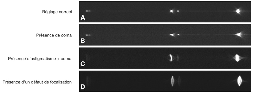 Le cas C correspond à un défaut de réglage à la fois du miroir M1 et du miroir M2 (une erreur sur le miroir tend à élargir la trace du spectre). Dans le cas D, la caméra est en plus mal focalisée.