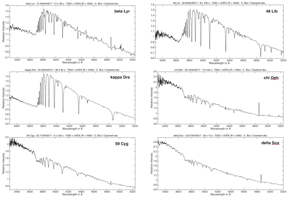 Pour patienter, voici un jeu de spectres caractéristiques provenant de ce spectrographe, qui donne une idée des possibilités. Noter aussi la diversité des configurations possibles. Ces données ont une vraie valeur scientifique et ont été acquises lors de la phase de mise au point du projet UVEX…