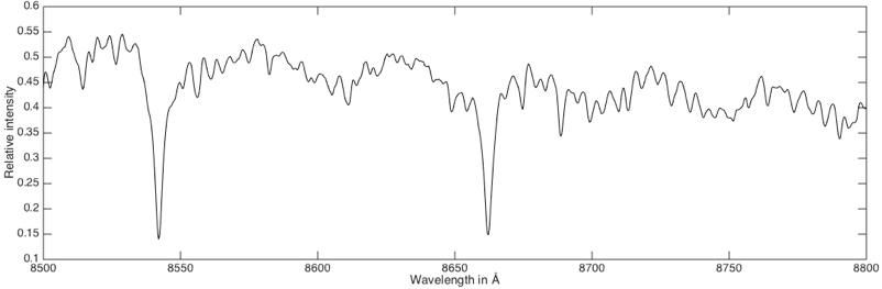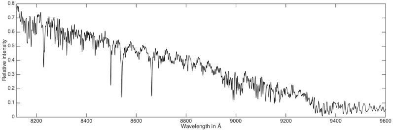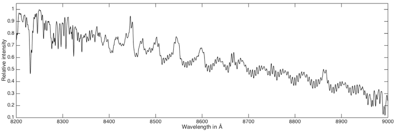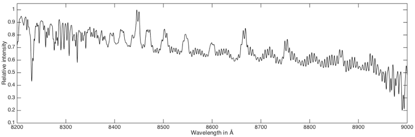 Here, the flat-field intensity along the spectral axis (full spectral domain and a detail near 8550 A):