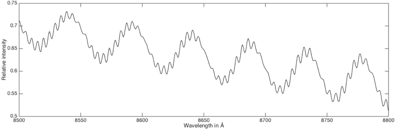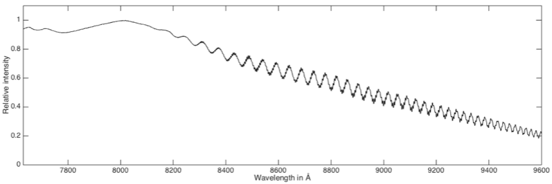 Top, the flat-field image carried with the equipment. The spectral axis is horizontal (the left wavelength is about 7600 A, the right is 9600 A). On the right view, a detail of the 2D spectrum. A dramatic double-wave structure is immediately obvious. The interference fringes are produced by internal reflections between two dioptric surfaces and/or into the detector substrate. The existence of this type of ripple is a well known phenomena, see here for example. But the amplitude is particularly important with the actual tested setup. The contrast of low-frequency fringes reached 10%, while it was 3% for the high-frequency fringes system.