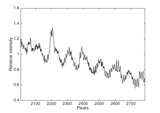 The high and low frequency ripples are clearly visible. It is the crucial point. Our major problem is the temporal instability of the fringe pattern. Below, a demonstration on a part of Υ Cas star spectrum. The sequence represents only 6 minutes of observation (!). During this interval the shifting of the fringes is important (especially the wide period system). In these non reproducible conditions, the correct calibration of the fringes is virtually impossible. Temperature drift of the camera detector (not regulated) is a possible explanation ?