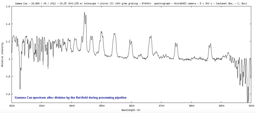 Below a more large portion of γ Cas spectrum, respectively before and after flat-field correction (the flat-field is captured only 5 minutes after science images with a minimum displacement of the telescope):