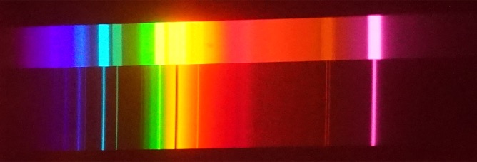 Domestic fluorescent lamp spectrum. The zero order image is on the left. Use of the Alpy 600 spectrograph attached to a IR-cut removed Sony A7s. The spectrograph entrance slit a photometric mode: 230 microns in the upper part, 23 microns in the bottom part. The image presented here is from the JPEG original file (« true » colors).