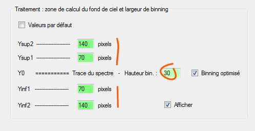 Etape 5. Lancer le traitement et analyse Cliquez à présent simplement sur le bouton "Go". Le traitement ne dure que quelques secondes (figure 10). ISIS effectue des opérations complexes pour vous. En particulier, les spectres 2D individuels sont parfaitement recentrés les uns par rapport aux autres, même si au moment de l’observation le télescope a été déplacé entre deux prises d’image (dans une certaine mesure on corrige ainsi des erreurs de suivi). ISIS génère lors de cette étape de nombreux fichiers intermédiaires qui vous permettent d'avoir un contrôle parfait du traitement. Cependant, le produit le plus intéressant immédiatement est bien sur le profil spectral calculé. Il est sauvegardé sous deux noms : @raw.dat et NomObjet_raw.dat. Les contenus de ces fichiers sont strictement identiques (sous la deuxième forme, le nom du fichier de sortie est "delta cas_raw.dat", un peu lourd à manipuler, d'où l'existence d'un fichier de nom plus compact "@raw.dat" pour vous aider). Si vous cliquez sur l'onglet "Afficher profil", le profil spectral de notre étoile est immédiatement affiché sans faire la moindre action (voir la figure 11). Parmi les fichiers intermédiaires, noter que le fichier @@.fit contient l'image composite de tous les spectres avant le retrait du fond de ciel et que l’image @@@.fit (ou NomObjet_2D.FIT) est l'image composite après le retrait du fond de ciel. Comme toujours, ces images peuvent être visualisées à partir de l'onglet "Affichage image". Les paramètres de binning du spectre 2D pour extraire le profil spectral ou encore la zone de calcul de calcul du fond de ciel sont fixés comme toujours dans ISIS depuis l'onglet "Configuration". Cette question va être discutée en détail à présent. La figure 12 montre par exemple l'image @@.fit du spectre de Delta Cas après addition des images individuelles. Elle est affichée avec un haut contraste. Rappelez-vous que dans l’image « @@ », le fond de ciel n'est pas retiré. Les zones de binning et de calcul du fond de ciel caractéristiques sont indiquées. Mais suivant les situations, il faudra modifier leur largeur et leur position (par exemple pour exclure de la zone de calcul du fond de ciel un objet brillant). La figure 13 montre la partie de l'onglet de "Configuration" qui permet de paramétrer ces zones. La figure 14, affiche l'image traitée après retrait du fond de ciel (image @@@.fit). Rappelez-vous qu'il est toujours possible de visualiser les zones de calcul du fond de ciel en sélectionnant l’option dans l’onglet "Configuration" (bouton à cocher "Afficher"). Astuce : pour bien bien voir le fond de ciel résiduel, ne pas hésiter à adopter un seuil minimal négatif pour le domaine de visualisation en intensité (comme l'indique la figure 14, ici -200). La