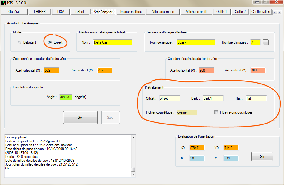 Complément. Traitement "Expert" Si vous cliquez sur le bouton "Expert" dans l'onglet "Star Analyser", le traitement réalisé est plus précis et rigoureux. ISIS effectue alors un prétraitement complet (voir la figure 16). Vous devez fournir une image d'offset, une image du signal d'obscurité (correspondant au temps de pose des images à traiter), et une image flat-field. De manière optionnelle, vous pouvez aussi fournir une liste de points du spectre à gommer à partir d'un fichier cosmétique, et même filtrer les rayons cosmiques (attention, si cette dernière option est choisie, la durée du traitement est fortement allongée). Il est très vivement de sélectionner l'option "Expert" dès que possible. Ce sera tout bénéfice pour vos spectres. A titre