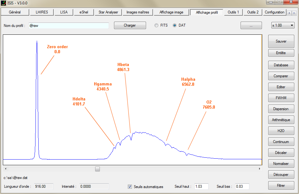 Etape 6. L'étalonnage spectral L'étoile Delta Cas est de type A5III, avec des raies bien marquées de la série de l'hydrogène, propices à un étalonnage spectral de précision. Nous disposons aussi de la raie de l'oxygène moléculaire dans l'infrarouge (7605 A) ainsi du spectre d'ordre zéro, qui peut être assimilée à une raie d'émission de longueur d'onde zéro Angström. La figure 18 indique la position de ces raies et leurs longueurs d'onde. Ouvrir l'onglet "Affichage profil", puis cliquer sur le bouton "Dispersion". Nous allons d'abord évaluer la position de l'ordre zéro en pixel le long du spectre. Note : l'ordre d'entrée des raies spectrales dans la boite de dialogue "Dispersion" n'influence pas le résultat final. Puisque l'ordre zéro s’affiche comme une raie en émission, sélectionner cette option en haut de la boite de dialogue (voir la figure 19). Faire deux doubles click de part et d'autre de la "raie". ISIS trouve en pixel la position X = 210.010. Indiquez 0 Angström pour la longueur d'onde cette "raie" (un peu particulière, mais utile malgré tout). Nous allons à présente sélectionner la raie Hdelta (figure 20). Attention, il s’agit d'une raie en absorption, bien sélectionné cette option au préalable. ISIS trouve la position X = 449.805. Associez la longueur d'onde correspondante de cette raie dans la boite de dialogue "Calcul de la dispersion spectrale". Poursuivez de la même manière pour l’ensemble des raies de votre choix (le nombre est libre, à concurrence d'un maximum de 12 raies). Dans notre exemple nous allons jusqu'à la raie O2 à 7605 A. Pas de soucis si vous vous trompez, vous pouvez à tout moment resélectionner la raie qui pose problème dans la liste. Le plus gros du travail est réalisé. Ouf ! Note : vous pouvez très bien étalonner votre spectre avec seulement deux raies, mais le résultat sera nettement moins précis. Comme dans un monde lidéal, l'effort paye. Choisir un