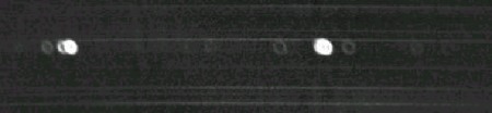 Voici par exemple le spectre typique d'une étoile observé avec un spectrographe utilisant une fente longue du doublet du sodium, dans la partie jaune. Le spectre est étalé suivant l'axe transverse à la dispersion, mais la résolution spectrale reste intacte :